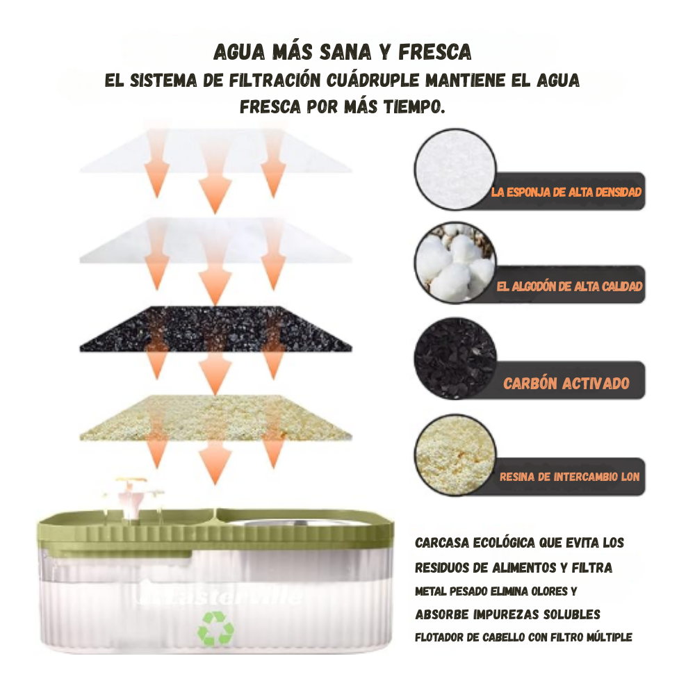 Sistema de filtración cuádruple: nuestro sistema de filtración de recirculación de suministros de alimentación y riego para gatos utiliza filtros compuestos de carbón activado, resina de intercambio iónico y algodón de filtro microporoso. La fuente de agua para gatos y el tazón de alimentos eliminan impurezas como el cabello, la suciedad y las partículas de alimentos y proporcionan a tu mascota agua potable pura.