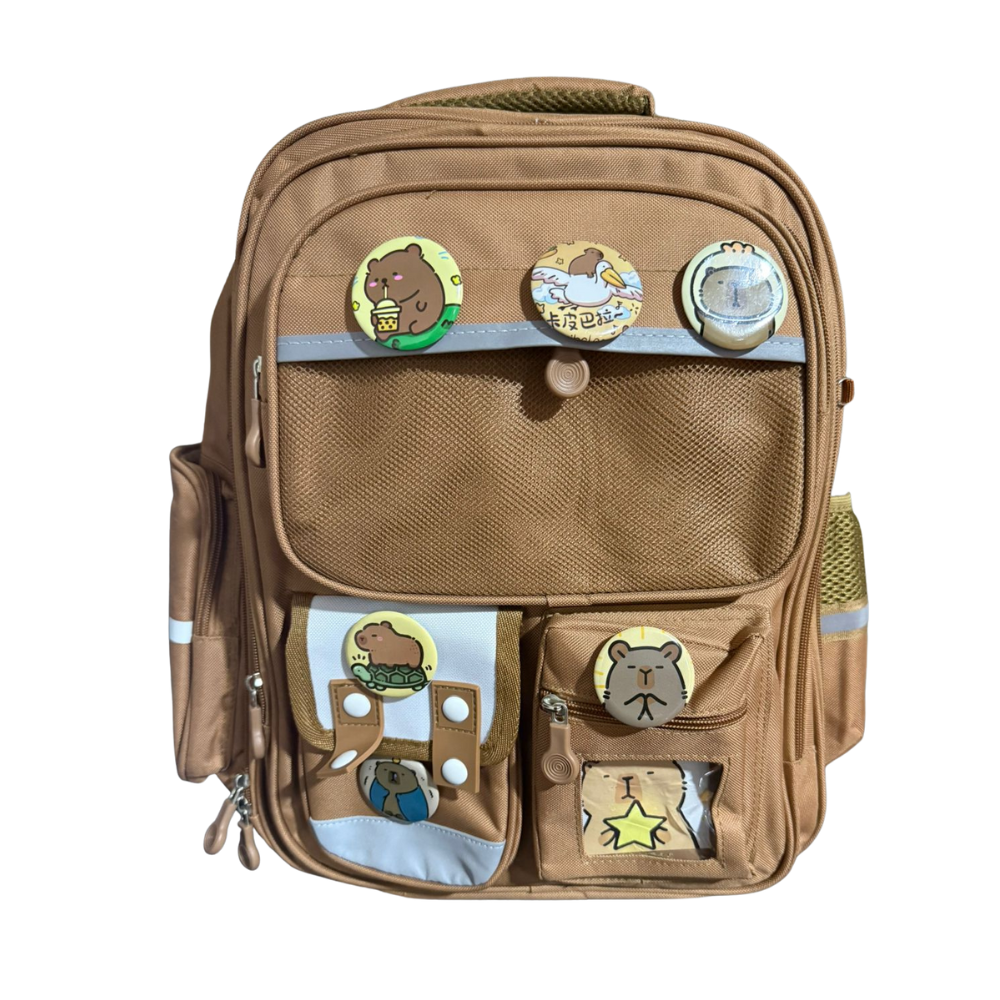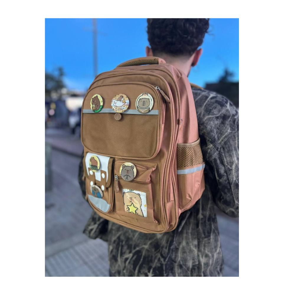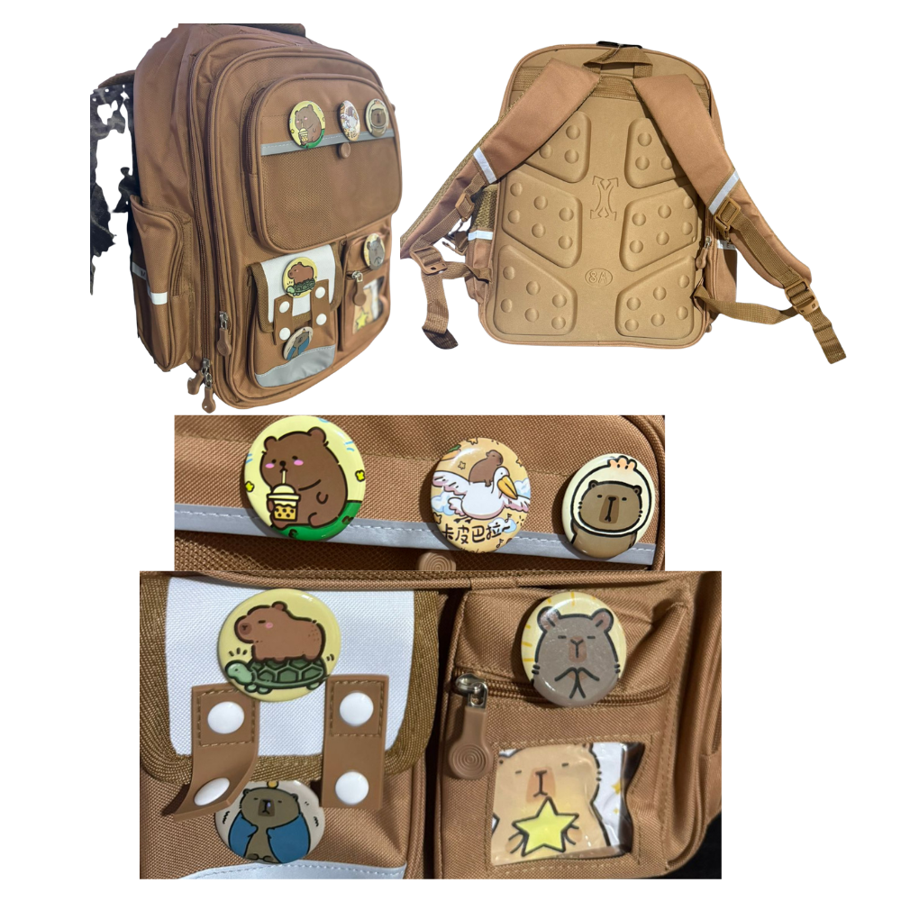 Una de sus características más destacadas es su diseño decorativo con temática de Kapibara. Incluye varios pines removibles con ilustraciones de Kapibaras y bolsillos con estampados adorables que hacen que la maleta no pase desapercibida. Estos detalles convierten la mochila en un accesorio único y con personalidad, ideal para quienes buscan un toque tierno y original en su estilo.